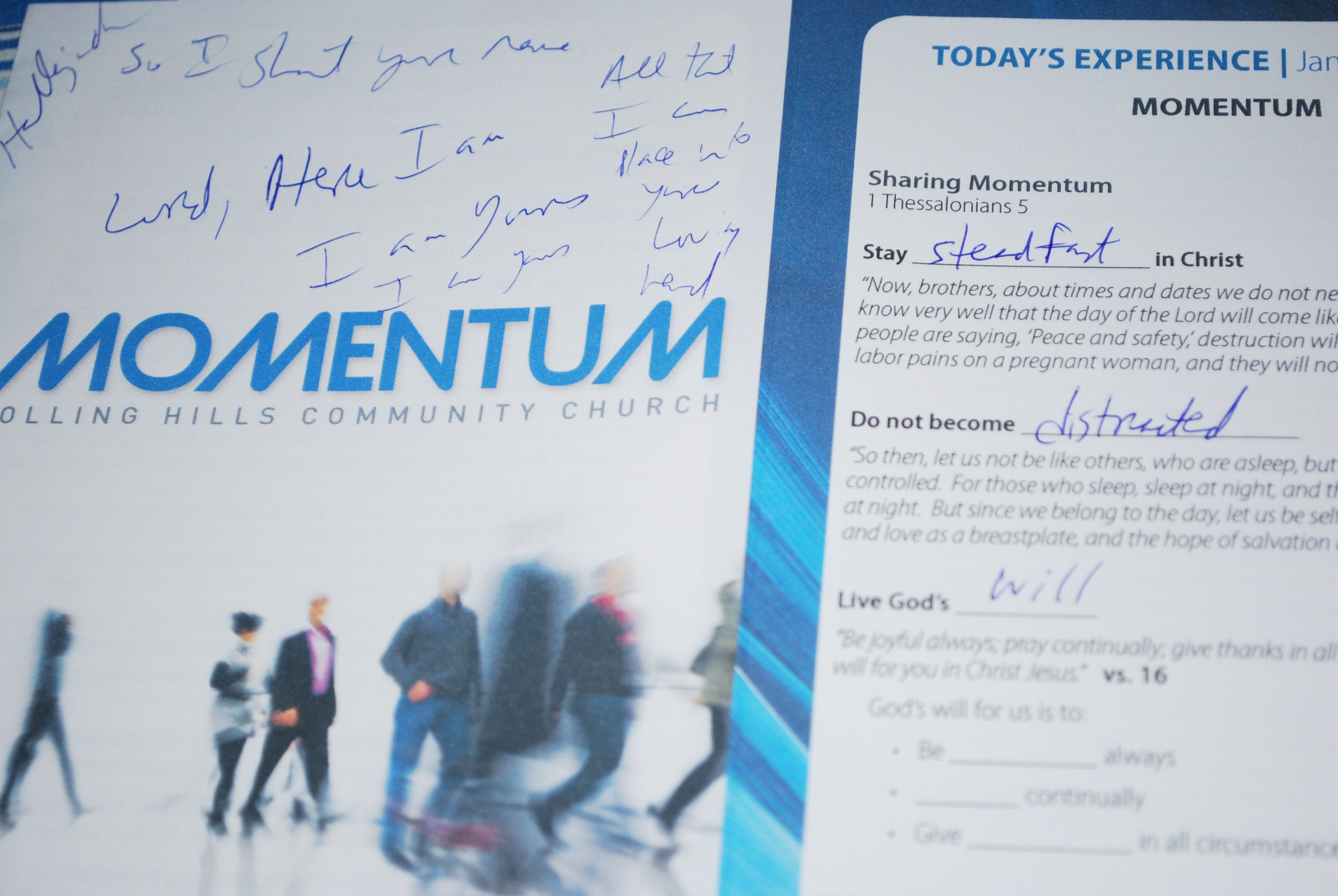 After finding several examples of where I had checked out of worship to write, I retrieved a few programs from the past several weeks. To my pleasant surprise, they looked much different. The same chicken scratch covered them, but instead of another plot twist, I was writing down key points the pastor had made. I was recording inspirations from God. Verses or analogies or key words that would later remind me of something important He was sharing with me. I was in communion with God.
