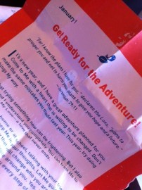 On Sunday, I stumbled upon a 365 devotion book that one of my kids had received as a present. It had never been opened. It just went straight to the bookshelf. I turned to the first page, and read, “Are you ready for the adventure? Are you ready to do things ‘my’ way this year?” It went on to say that there was so much waiting for me, that I had no idea. Was I ready for the call?